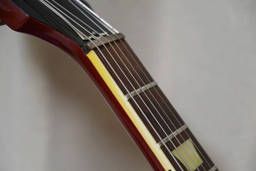 フレットはオリジナルですが、すり合わせをやっているので高さは低くなりましたがまだ大丈夫そうです。フレットエッジバインディング。ギブソンらしさ(トーカイなのに)を感じられる重要なポイントです。