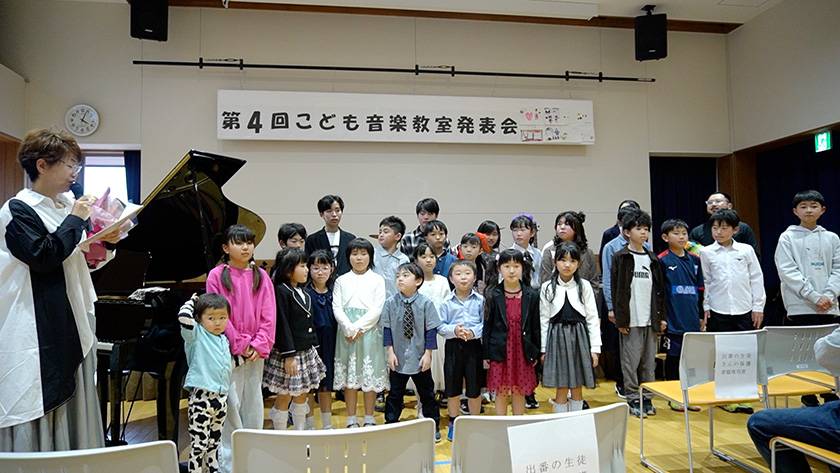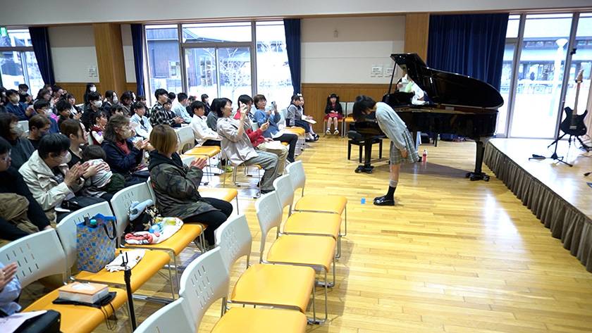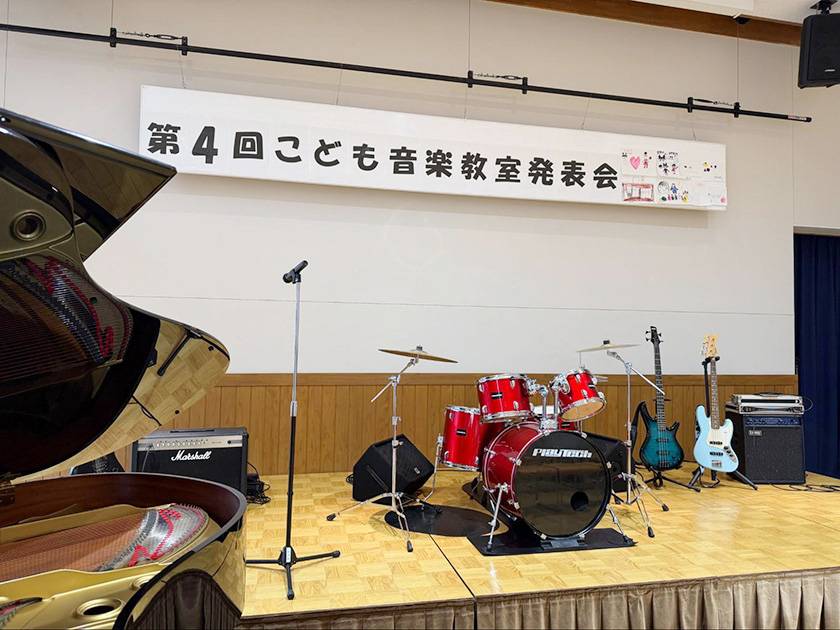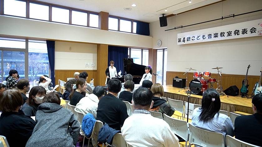 桜が見頃を迎えた2026年4月4日、サウンドハウスが宮城県女川町で開講している「こども音楽教室」の発表会が行われました。会場は町内のミュニティセンター「女川まちなか交流館」。