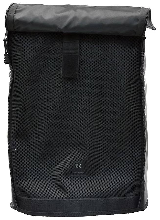 フロントカバーは、両端の防水ファスナーを開けて、下からくるくる丸くまとめて、上部にあるマジックテープで留めておくことができるようにしました。カバーの下をメッシュ地にすることで、音質への影響と、スピーカーへの悪影響(水、固形物の侵入)を最小限に抑えつつ、音を出すことができます。