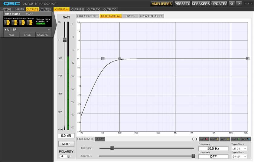 OUTPUT AのFILTERS/DELAYタグを押した画面がこちらです。ここではハイパスフィルター、ローパスフィルター、ディレイを設定します。この画面では、ローパスフィルターが50Hz、スロープタイプは、LR24(Linkwitz–Riley 24dB/oct)が選択されています。