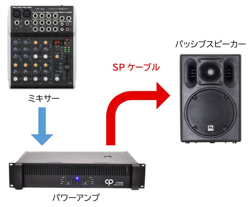 例1: ミキサー → パワーアンプ → パッシブスピーカー