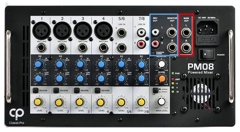 PM08の場合、赤枠のMAIN OUTはパワーアンプを通っていますが、青枠のMONITOR OUTはパワーアンプを通っていません。