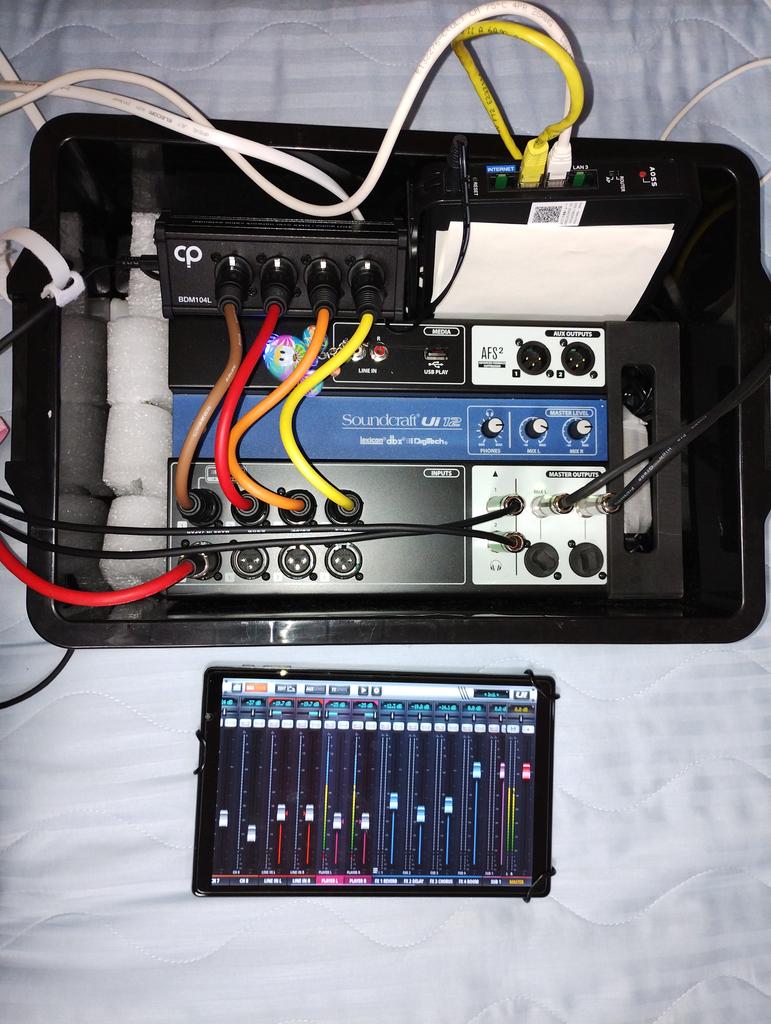 Ui12のサイズを生かして、電源タップ、アダプター、5Gルーター、マルチケーブルボックス(BDM104L)をコンテナボックスに入れて持ち運んでいます。現場で電源つなげなげてPC(有線)、タブレットを起動すればOKです。