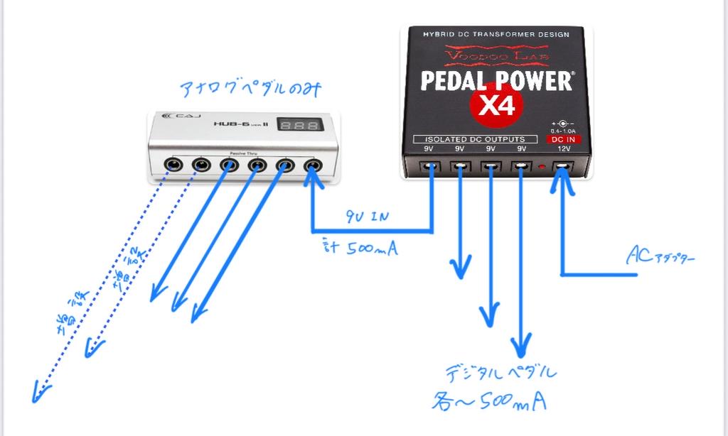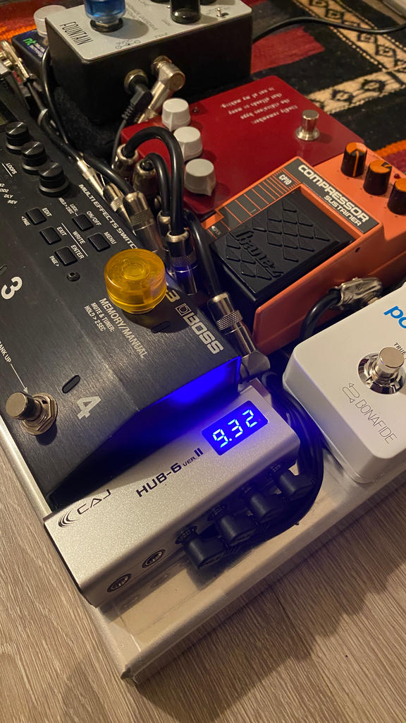 | Voodoo Lab X4の拡張用として購入しました。 X4はアイソレートが4口で、1口をHUB-6に接続。 アナログエフェクターが1個→5個まで使えるようになりました。 DC分岐ケーブルを使っていたときより、 エフェクターの動作が安定している印象です。 HUB-6に供給されている電圧状況 =X4の状況がわかるようになり、 エフェクターボードの電源管理もできるようになりました。 またボードの外側に設置することで、 ボード外にエフェクターを増設することも可能です。 写真をアップしました。ワウやファズを足すのに便利です。 ![]() | ||