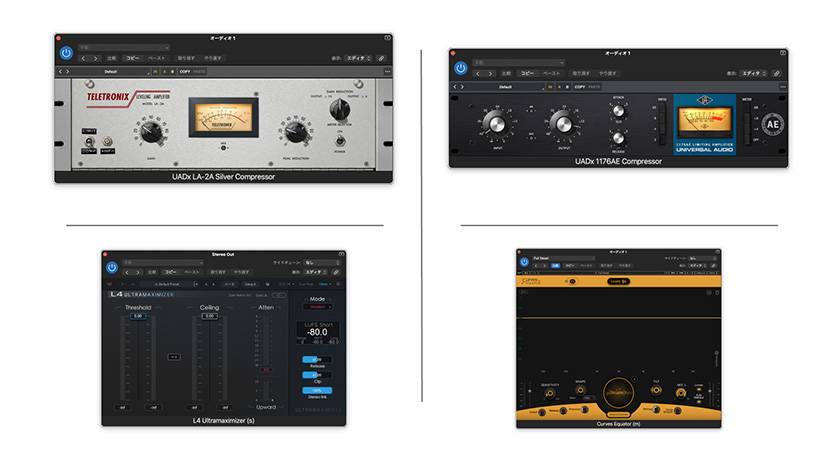 今回はスルーしましたがSSL 4000 G Bus CompressorやFairchild 670なんかもそうです。余裕があればこの辺も差し替えて行きたいくらいには、UADのアナログモデリングプラグインは素晴らしい……。