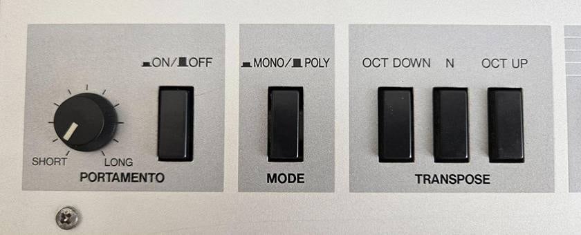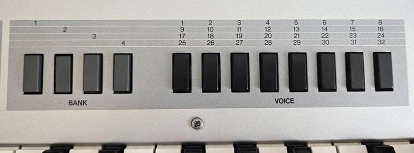 余談ですが、TRANSEPOSE、BANK、VOICEはそれぞれ二つ以上のボタンの同時押しができません。どれかボタンを押すとそのボタンは押し込まれた状態になり、元々押されていたボタンがカチッと戻ってきて面白いです。昔のカセットデッキを彷彿とさせるギミックです。