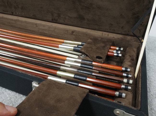問屋さんから新作の弓を複数、10本くらいお借りしてその楽器に合わせてみます。Seifert, Finkel、Otto Durschmittなどのドイツ製、スイス製などのメジャーな弓ブランドから選んでいくのですが、この「楽器に合わせて弓を選ぶ作業」というのは文字通りの「作業」で、思いのほか冷静に段取りを決めて音を出していかないと、ただのお遊びになってしまいます。