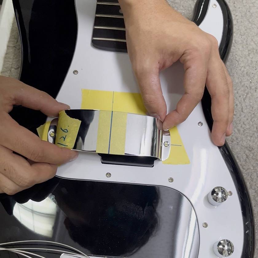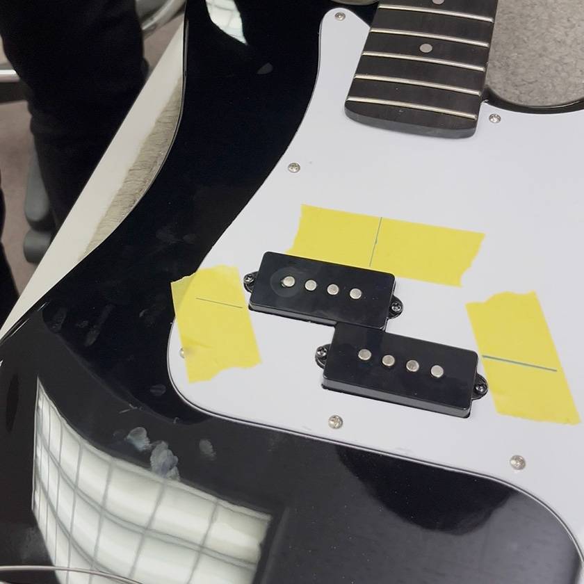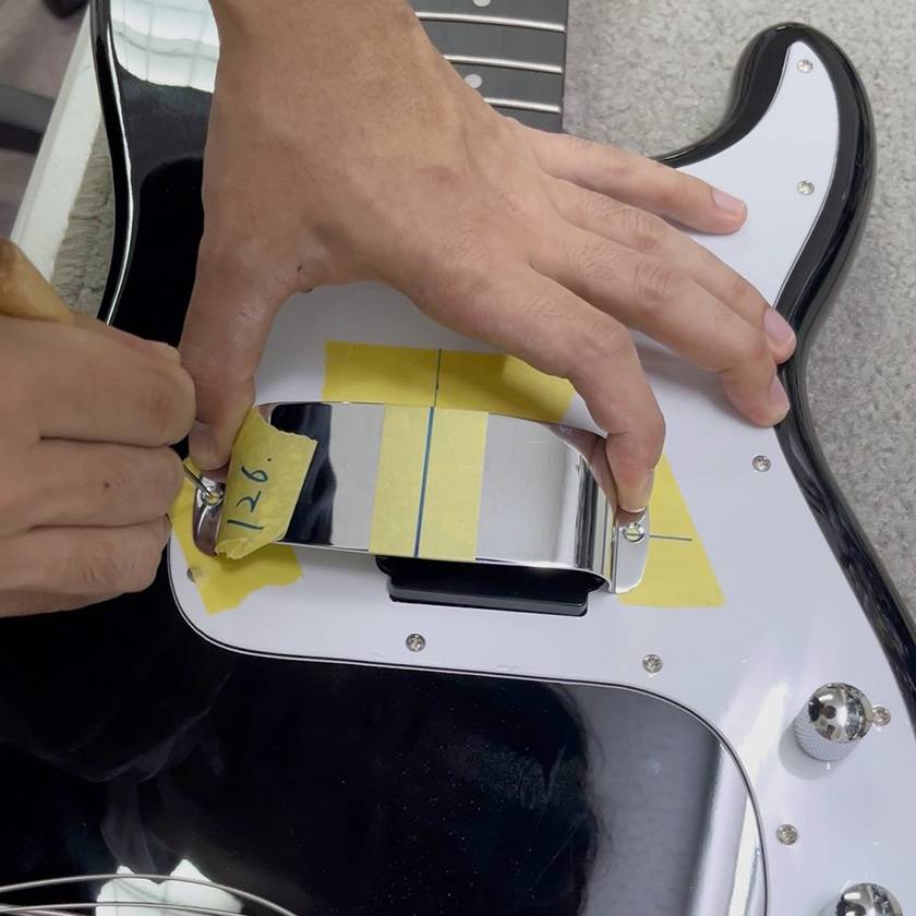 ピックアップとPUフェンスのサイズをそれぞれ定規で測り、マスキングテープの上に印をつけながら縦横の中心を確認していました。L型定規があると便利そうです!