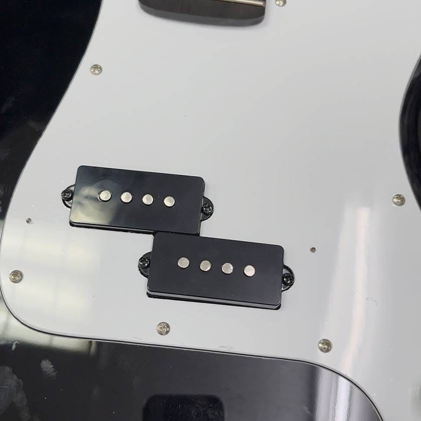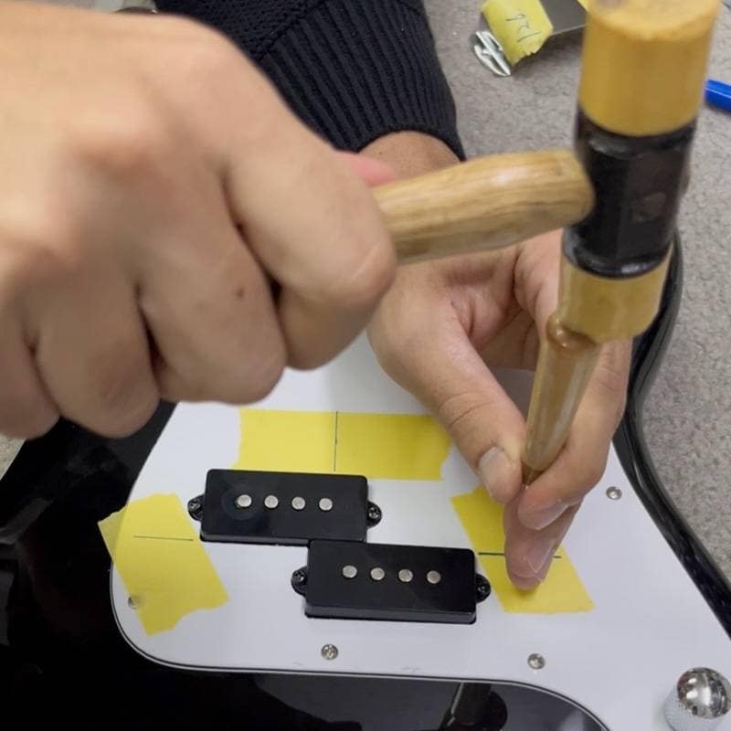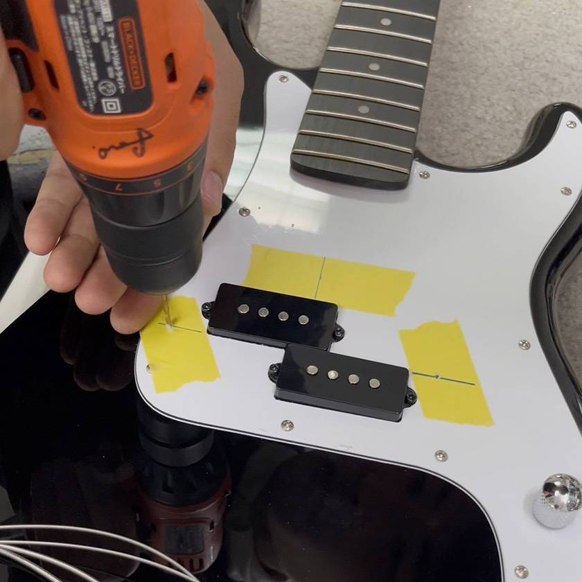 下穴のガイドを元にドリルでピックガードとボディに穴をあけ、マスキングテープを剥がして弦を張り直し、最後にPUフェンスをネジで固定して完成です!
