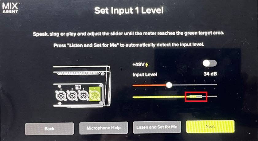 マイクでしゃべりながら、黄緑メーターが赤枠で囲んだ範囲に届くように、赤メーターのInput Levelを調整するだけで完了です。