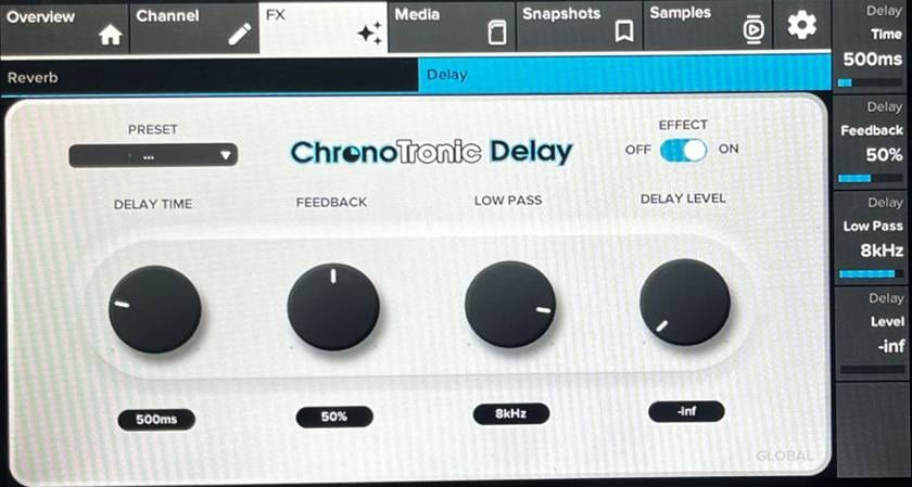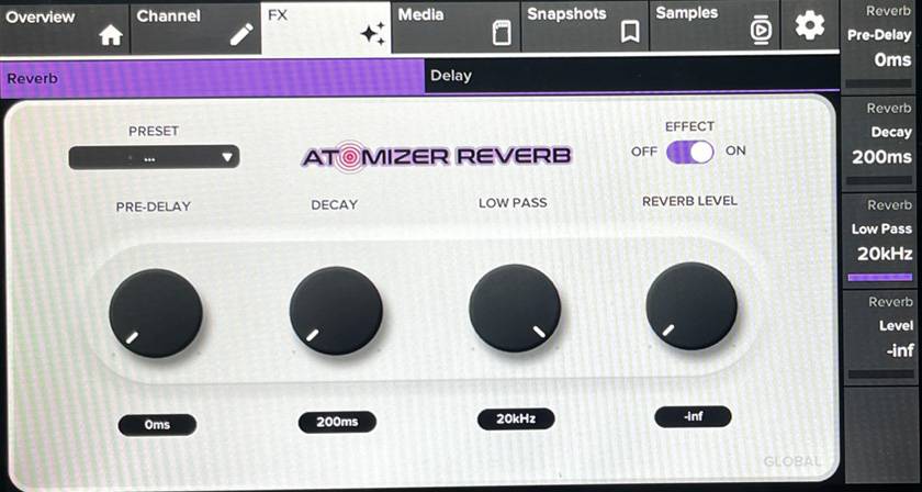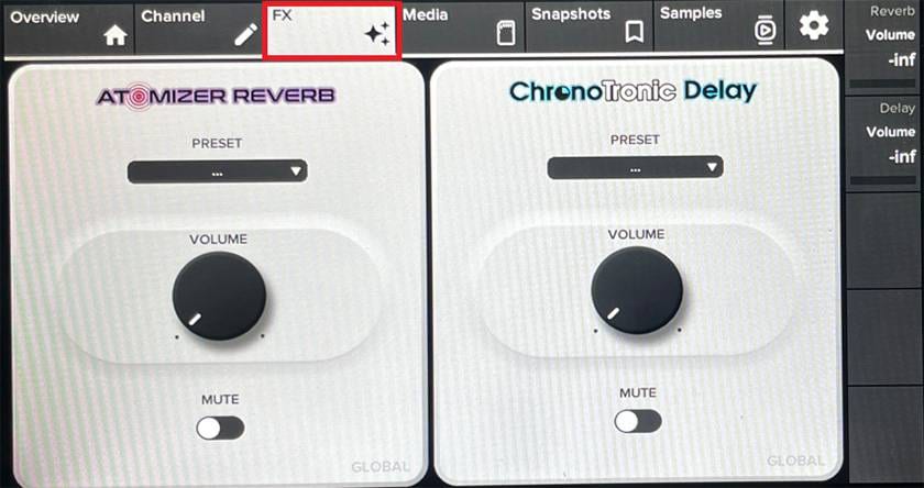 FXは、REVERBとDELAYをVOLUME、MUTEのみとシンプルなコントロールで調整できます。