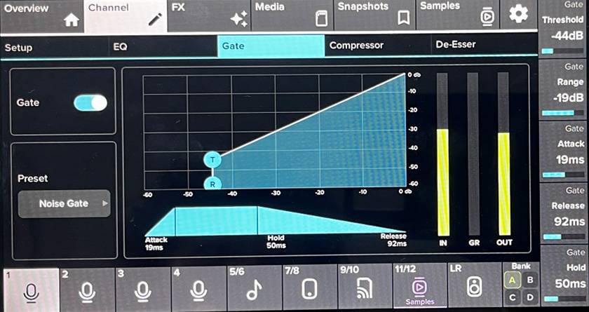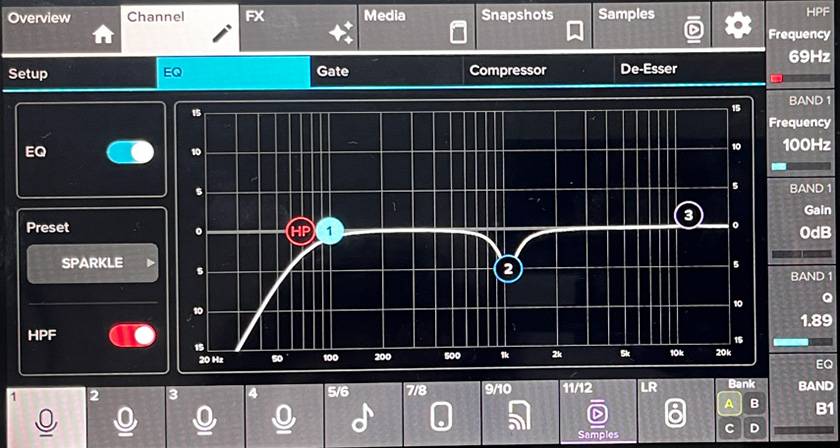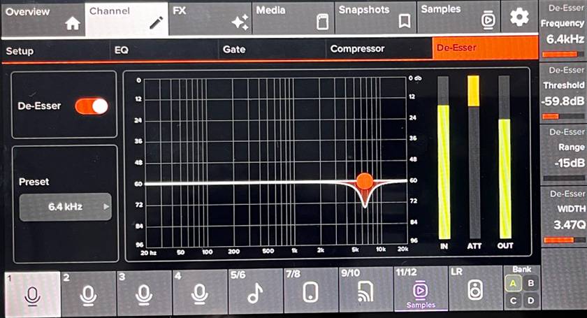 「HF、3バンドEQ、Gate、Compressor、De-Esser」が調整できます。