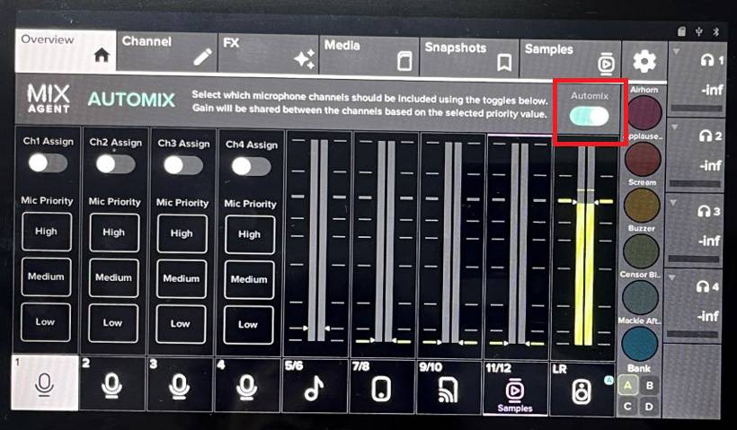 画面上部に表示される「Automix」をONにし、ch1-4の「Assign」を使用環境に合わせて「ON」に切り替えるだけです。