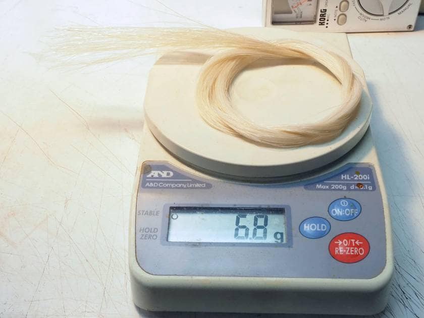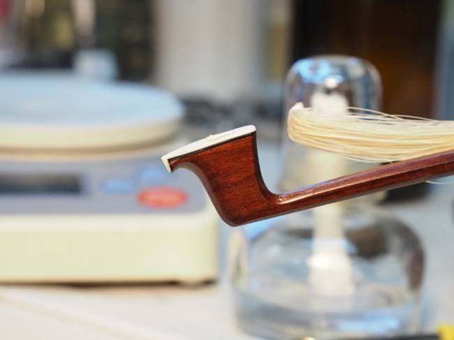 ここまでの説明の通り、実際に弓の毛替えをする際には楽器種によって、また元々の弓の総重量から計算して使う毛の量を決めたりもします。毛替えをしてみて元の重量から極端にかけ離れてしまったりした時はやりなおしをすることもあります。