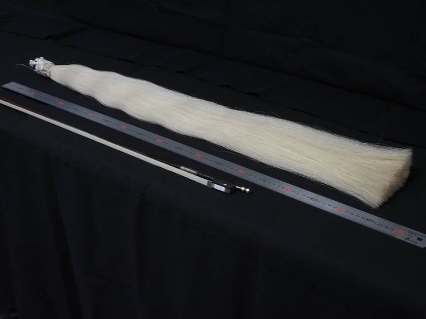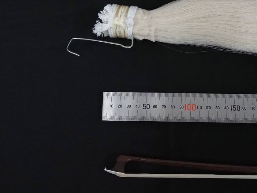 馬の尾毛は黒い色をしていますが弦楽器の弓の毛は白いものがほとんどです。これは尾毛を漂白しているからです。一説には白馬の尾毛は白い、と聞いたことがありますが筆者は実際にこれが白馬の尾毛です、という現物を見たことがありません。
