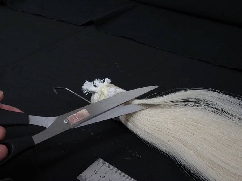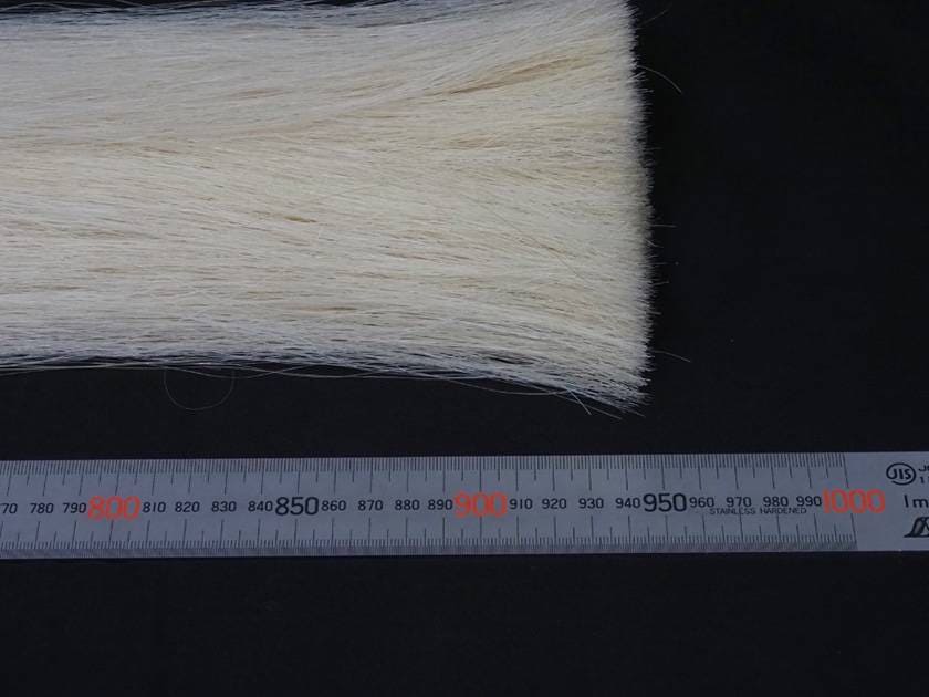 この漂白された尾毛が長さ90cm程度に揃えて、重さ1kg程度の棒状に束ねて、商品として流通していますが、これを通称「毛束」と呼んでいます。金額はここには記載しませんが意外に高価なものではあります。モンゴル産のものが上質とされていますが、筆者はそれ以外の産地の毛束というのは見たことがありません。この画像の毛束は95cmのものです。画面の右下が毛先で、少し茶色がかっています。