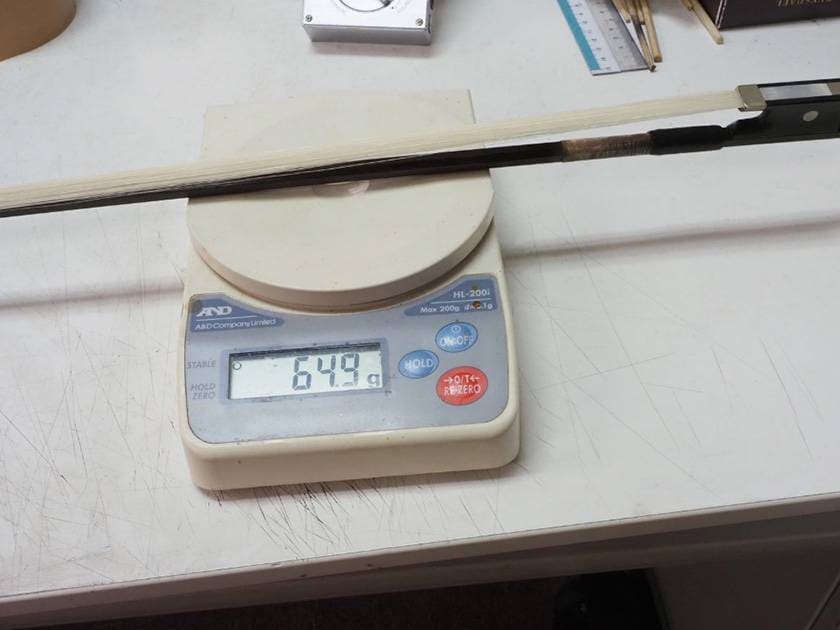 使う毛の量を割り出して最終的に毛替え前と同じ重量にできれば最適な結果、になるはずだからです。しかし使う松脂、塗り方でも微妙な差は生じますので完璧に同じ、というのはなかなか難しいところです。ただこの弓の計量で、ラッピングは外していないのでこれについては次回以降にまた説明を致しましょう。