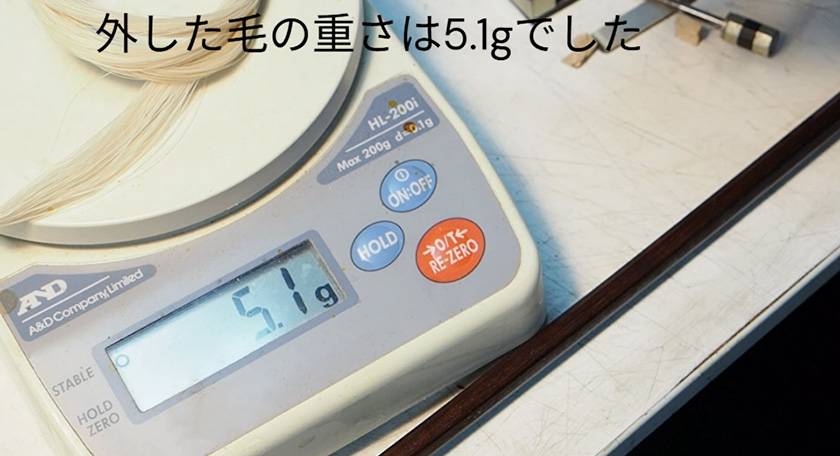 2. 毛替え前の弓の重量の計測、また場合によっては外した毛の重さも測る