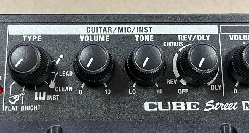 GUITAR / MIC / INSTチャンネルのTYPEつまみは、マイク向けのMIC、エレキギター向けのLEADとCLEAN、それからキーボード、エアロフォンなどのライン機器向けのINST、アコギ向けのBRIGHTとFLATがあり、さまざまな楽器・機器の接続に対応しています!