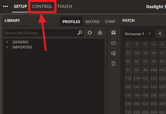 それでは、実際に照明を動かしてみましょう!まずは、画面左上の「CONTROL」をクリックします。