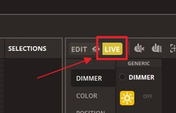 次に、LIVEモードに切り替えます。LIVEモードは、その場で一時的に照明を操作する際に使用します。EDITは動作を保存しておくモードになるので、シーンを作成する場合はEDITで作成してください。EDITでシーンを作成した後にEDITでパラメーターを変えると動きが変わってしまうので、注意しましょう!