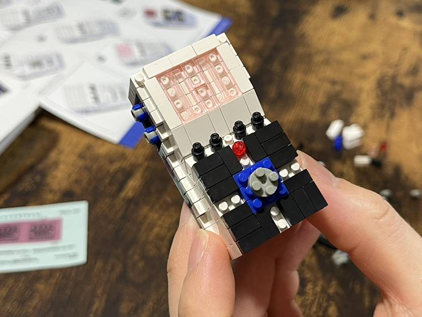 どうでしょうか。4つのコントロールノブ、矢印こそありませんが4つ並んだボタン、真ん中のスイッチ、赤いライトなど、実機の印象を非常によく捉えていると思います。曲面部分の処理などはブロック化にあたり「ドット絵」の雰囲気もあり、とてもかわいいです。