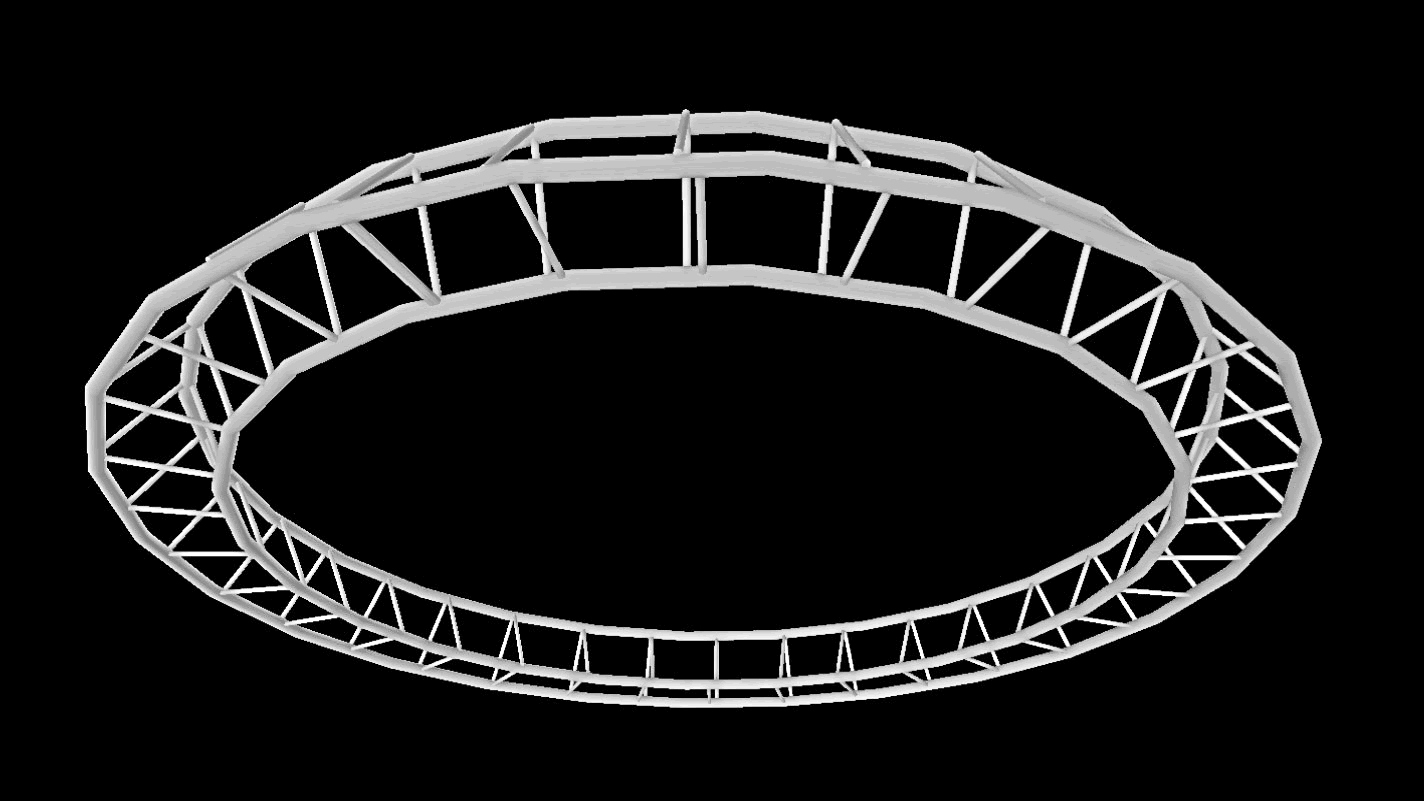 It is a truss raised in a circle. In the case of ceiling suspension with the pillar removed, anchor bolts are used for suspension. They are also used for displays by installing it on a wall or the likes.