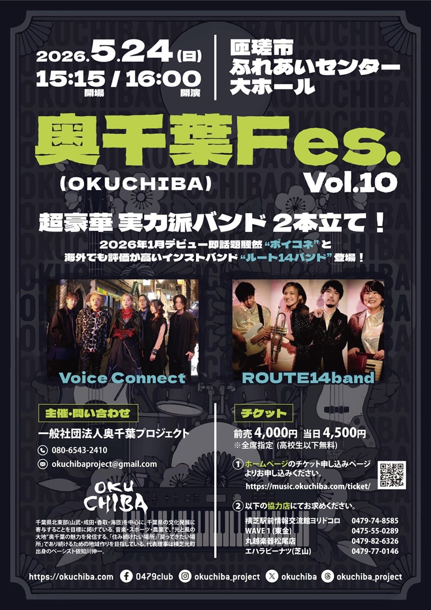 The “Okuchiba Fes.” music festival, organized by professional bassist Shin Ichikawa and held in northeastern Chiba Prefecture since 2021, celebrates its 10th anniversary this year. Headlining this milestone event are “Voice Connect,” who caused a sensation immediately after their debut this January, and the internationally acclaimed instrumental band “Route14band”! For event inquiries, please contact the organizer (Okuchiba Project).
