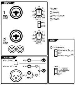 DBRシリーズはCH1, CH2の2系統の入力を持ちます。CH1にはマイク、ラインレベル切り替えが可能なコンボ端子(XLRまたはTRS Phone接続)、またCH2には、コンボ端子とRCApinのラインレベル入力を備えています。出力コネクターの信号は、CH1とのパラレル接続またはCH1とCH2のミックスアウトが選択可能となっており、システムの拡張も容易です。