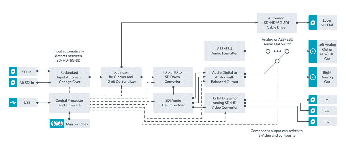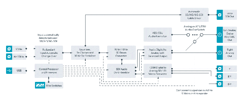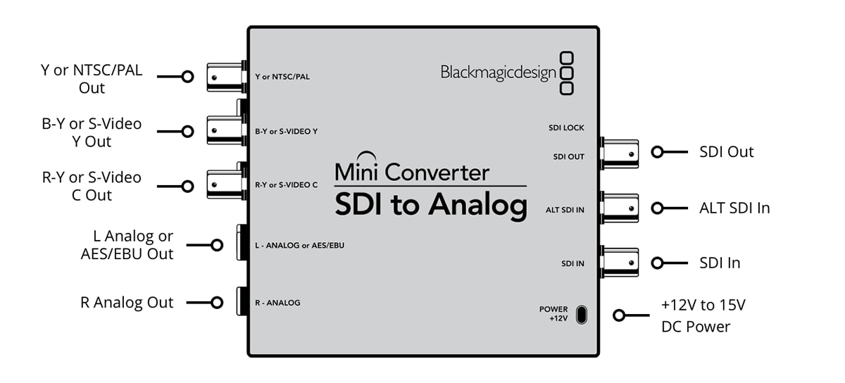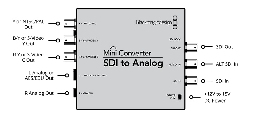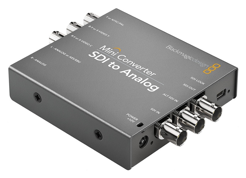 SD/HD-SDIを、アナログコンポーネント、Sビデオ、NTSC/PALコンポジットに変換する最適なソリューションです。Mini Converter SDI to Analogは、1080p30までのあらゆるSD/HD入力フォーマットに対応。搭載されたダウンコンバーターは、必要に応じてHDをSビデオやコンポジットなどのSDアナログフォーマットに変換します。オーディオはバランスアナログまたはAES/EBUにデエンベッドできます。Mini Converter SDI to Analogは、古いアナログ機器への変換において、6G-SDI 4Kモデルを購入する必要がない場合に最適です。