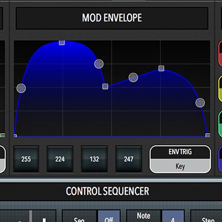 各ボイスに 3系統の4ステージADSR を搭載し、カーブを連続可変できる柔軟な設計。トリガーモードは Legato / Mono / Retrigger に対応。キー入力、各LFO、コントロールシーケンサーからのトリガーも可能で、オーディオレートでのループ動作にも対応します。音作りに求められる細かなニュアンスを、思い通りに描けるパワフルなエンベロープです。