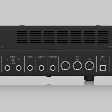 サーボバランス対応ステレオ TRS 出力、ヘッドホン、サステイン、ペダル/CV、MIDI(IN/OUT/THRU)、USB-MIDI を搭載。外部機器や DAW/PC との連携をスムーズに行えます。MIDI 実装も非常に充実しており、ほぼすべてのパラメーターを NRPN/CC でコントロール可能。バルクロード/セーブにも対応しています。