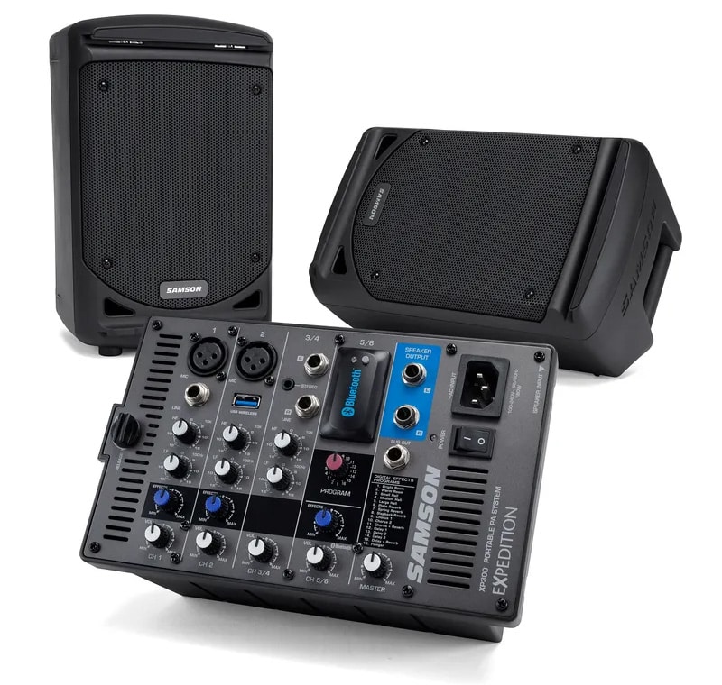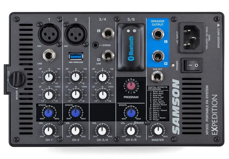 マイク接続用のXLR入力を2系統、MP3プレーヤーなどの電子機器からのステレオ信号を接続できるチャンネルを1系統備えています。また、24ビットデジタルエフェクトプロセッサーを内蔵し、声や楽器にスタジオクオリティのエフェクトを加えることができます。音楽再生には、XP300はBluetoothワイヤレス接続に対応しており、スマートフォン、タブレット、コンピューターからオーディオをストリーミングできます。このミキサーは、軽量なクラスDアンプ部から合計300ワットのパワフルな出力を供給します。