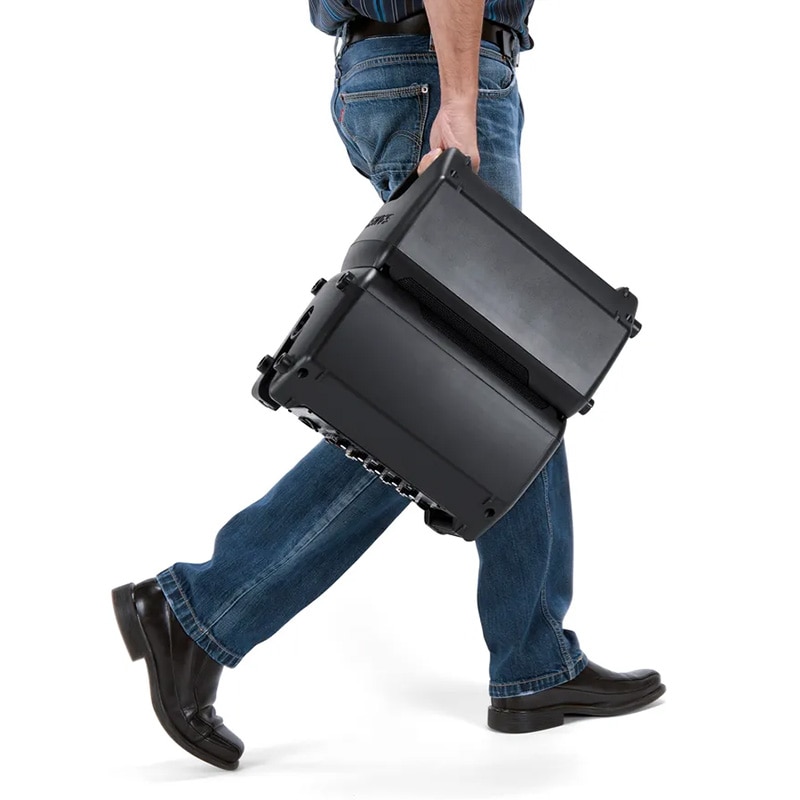 XP300 は、携帯性を高めるために、独自のスライド アンド ロック スピーカー設計を採用しており、システムとそのすべてのコンポーネントを 10.3kgの重量の単一ユニットとして梱包して持ち運ぶことができます。