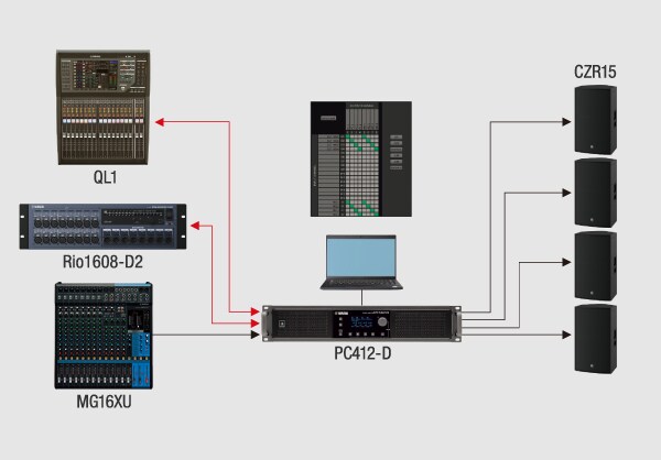 2つのインプットラック(Rio8-D)のDante入力からPC412-DIに直接音声信号を入力するシステム例です。入力マトリクス機能を使用して、双方を組み合わせた音声信号をスピーカーに送出できます。また、Dante出力を使用すれば、PC412-DIでEQ調整を施した音声信号を他のアンプに送ることも可能です。