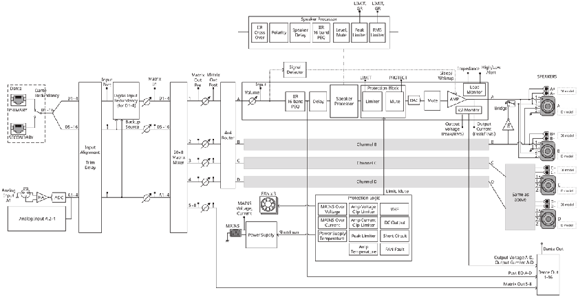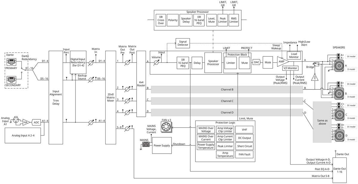 PC-D/DIシリーズアンプの強力な20×8入力マトリクス機能とDante I/Oを組み合わせることで、あらゆるシステムの汎用性を飛躍的に向上させることができます。PC-D/DIシリーズの入力マトリクス機能は、システム全体を拡張する補助マトリックスとしてだけでなく、ミキサーやDSPを追加していないシステムにおいても他のアナログ機器やDante搭載の機器から直接音声信号を入力できるため、より柔軟なルーティングが可能となります。また、本体に搭載されたDanteの入出力は、最大96kHzの16ch入力/16ch出力の低レイテンシー音声信号をリダンダント(二重化)接続することも可能です。さらに、PC-D/DIシリーズとProVisionaire Control PLUS/Kioskなどのリモートソフトウェアを組み合わせることで、より柔軟で直感的な制御環境を構築できます。