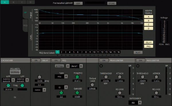 PC-D/DIシリーズアンプは高性能なスピーカープロセッサを標準搭載し、16バンドPEQ、ディレイ、ピークリミッティング、RMSリミッティングなどの機能用いてスピーカーのチューニングやダイナミクス制御を正確かつ容易に行うことができます。また、Dante出力を使ってRoom EQのパラメーター設定を他のアンプに送出することができ、複数のアンプチャンネルのEQを集中的に制御することも可能です。さらに、スピーカーのプリセットライブラリーにはヤマハCZRシリーズなどに最適化されたデータが豊富に用意されているため、システムに合わせてプリセットを選択することでスピーカーをより簡単にチューニングすることができます。