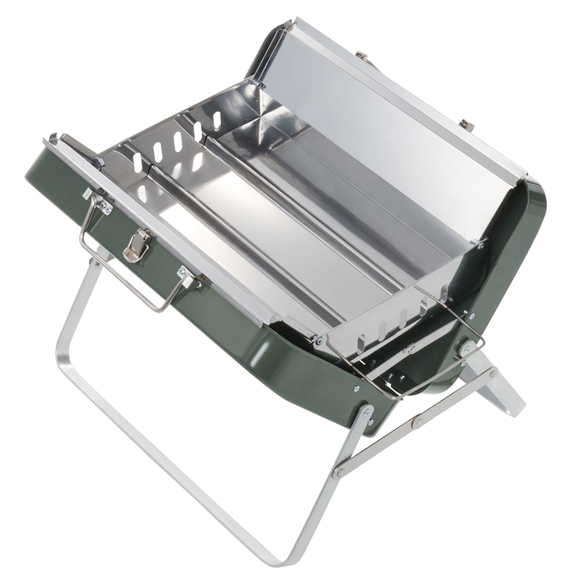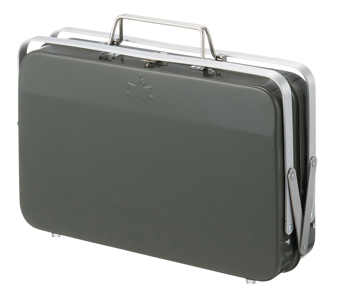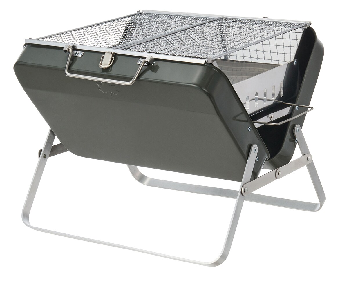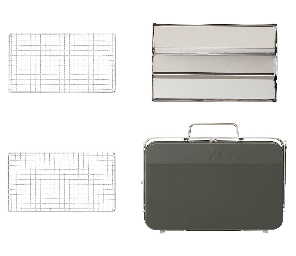 Logos grill in the shape of an attaché case that can be carried around smartly. It can be assembled by simply stacking the parts stored inside. The wide-angle open type case makes the cooking area wider.