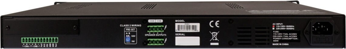 The HVA1 is a class D amplifier for facilities. It supports both 70V/100V high impedance operation (selectable with a dip switch). Each channel is equipped with gain control and LED indicators (signal/clip/protection). The input and output terminals are Euroblocks. It is 2CH and 1U in size, making it suitable for a variety of situations.