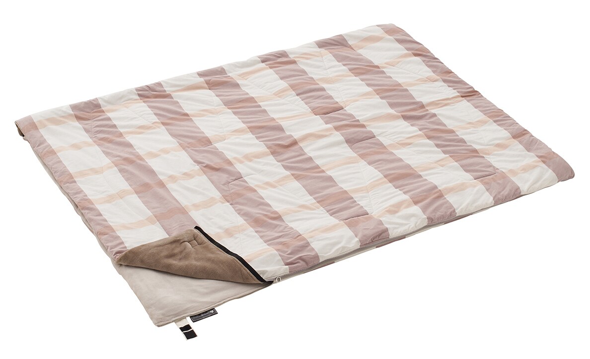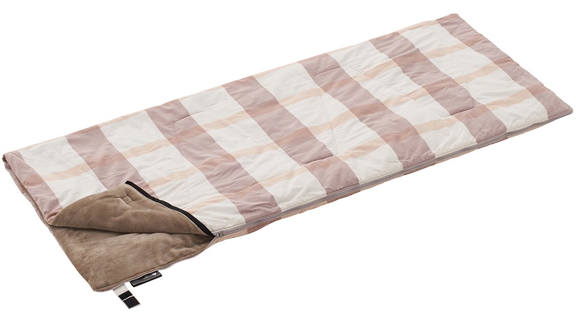 This envelope-type sleeping bag is made of a distinctive material, with a cotton fabric that feels good on the skin and a soft flannel on the skin side. The filling is made of lightweight and warm Dynatube fiber. The gentle colors of the checkered pattern are not too bold and suit any scene. If you connect the same sleeping bag to make a W size, parents and children can sleep together.