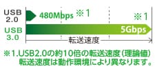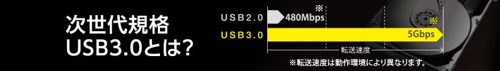 理論値上USB3.0の転送速度は、USB2.0の約10倍!外付けHDDなどへの大容量データ転送に最適。