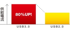 USB3.0の給電できる電流が、USB2.0より80%アップ!複数の機器をつないでも安定して動作します。外付けHDDなどの消費電力の大きな機器にも対応。