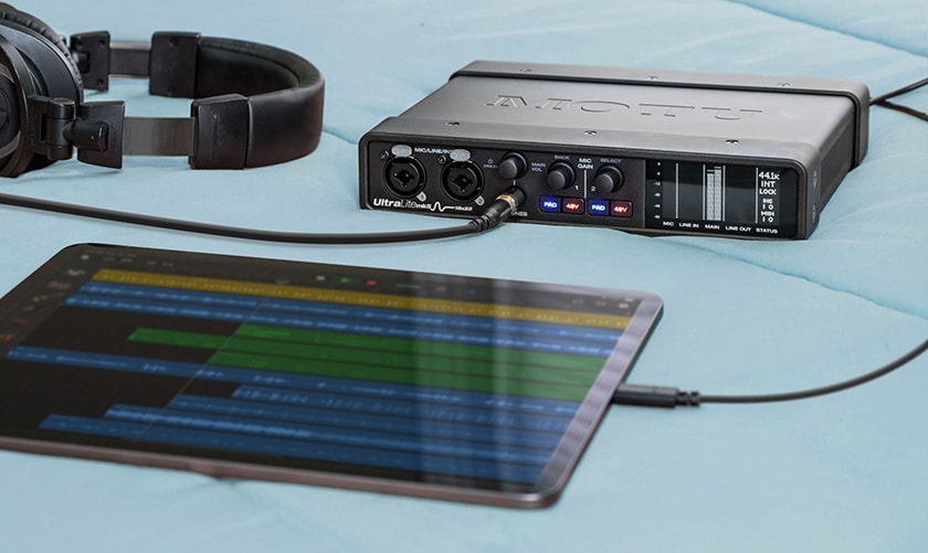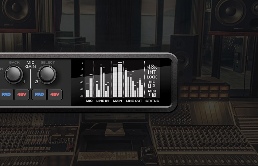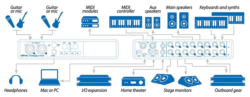 スピーカー、ヘッドフォン、マイク、ギターなど、あらゆるオーディオ機器との接続が可能。シンセサイザー、キーボード、ドラムマシン、エフェクトプロセッサーやアウトボードの併用はもちろん、MIDIデバイスとの接続、インターフェイスとして使用できます。