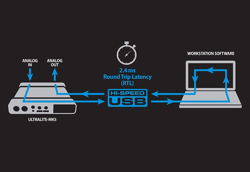 UltraLite-mk5はDigital PerformerなどのDAW使用時、USB接続(96 kHz・32サンプル)で2.4msという極めて低いラウンドトリップレイテンシーを達成します。