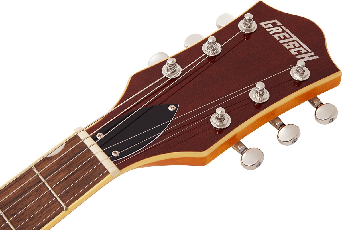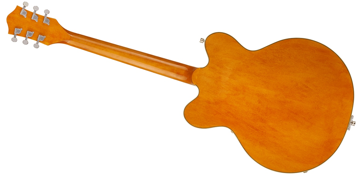 ■Semi-acoustic guitar ■Color: Black Gold ■Specifications ・Top: Laminated maple ・Back: Laminated maple ・Center block included ・Finish: Gloss ・Body binding: Aged white with B/W/B Purfling ・Neck: Maple, set neck, Thin "U" ・Scale: 24.6" (625mm) ・Fingerboard: Laurel, fingerboard radius 12" (305mm), 22F medium jumbo ・Nut: Graph Tech NuBone, 1.6875" (42.86 mm) ・Position inlays: Pearloid Neo-Classic Thumbnail ・Pickups: Black Top Broad'Tron ・Controls: Volume 1. (Neck Pickup), Volume 2. (Bridge Pickup), Master Volume, Master Tone ・Pickup switch: 3-Position Toggle: Position 1. Bridge Pickup, Position 2. Bridge and Neck Pickups, Position 3. Neck Pickup ・Bridge: Adjusto-Matic ・Tailpiece: Gretsch V-Stoptail ・Tuning machines: Die-Cast Sealed ・Pickguard: Gold Plexi with Black Gretsch and Electromatic Logos ・Strings: Nickel Plated Steel (.010-.046 Gauges) ■Accessories: Soft case
