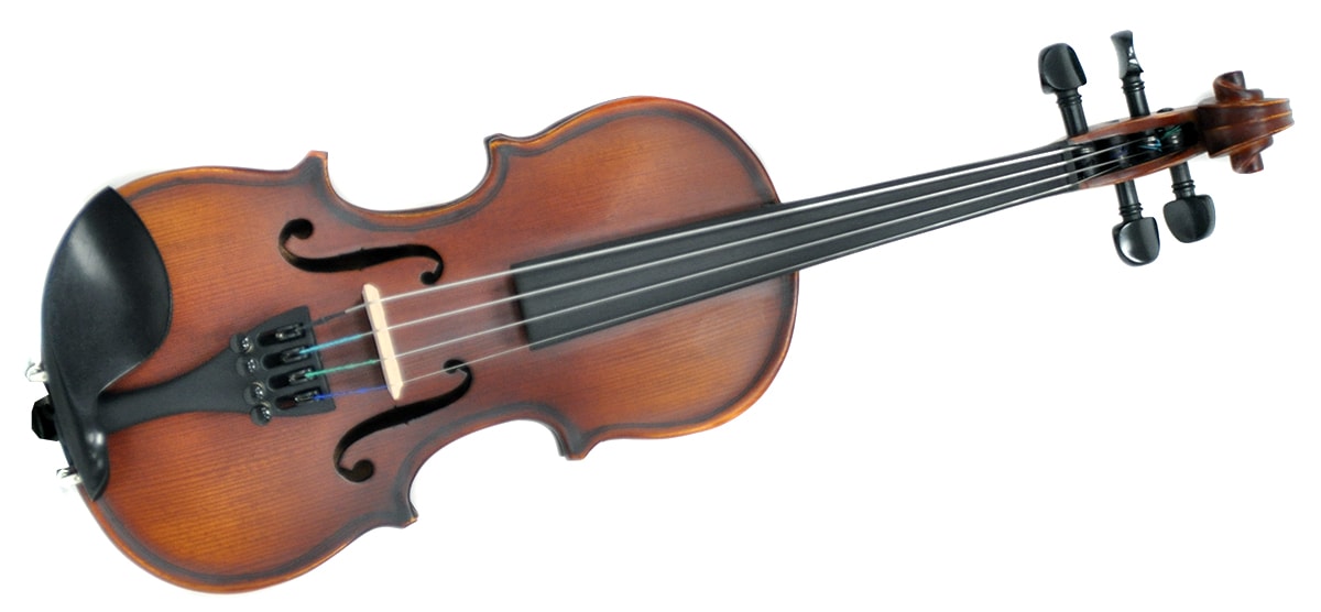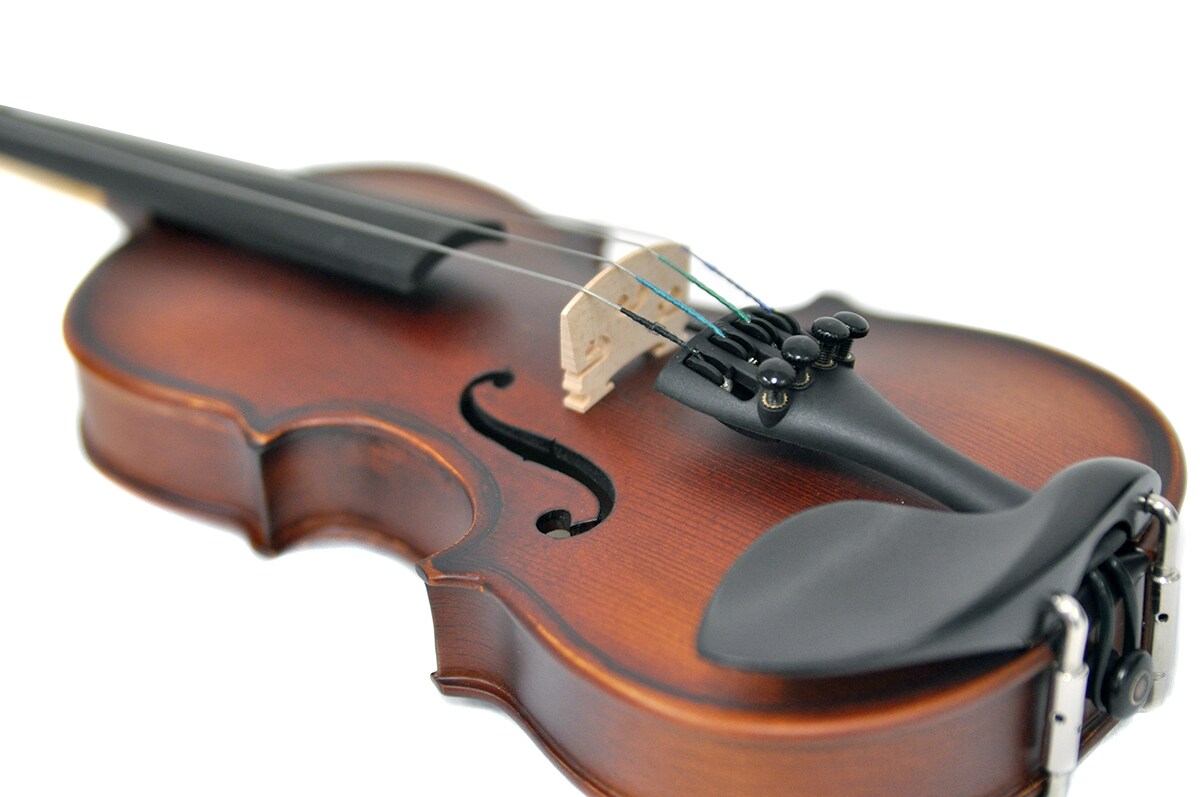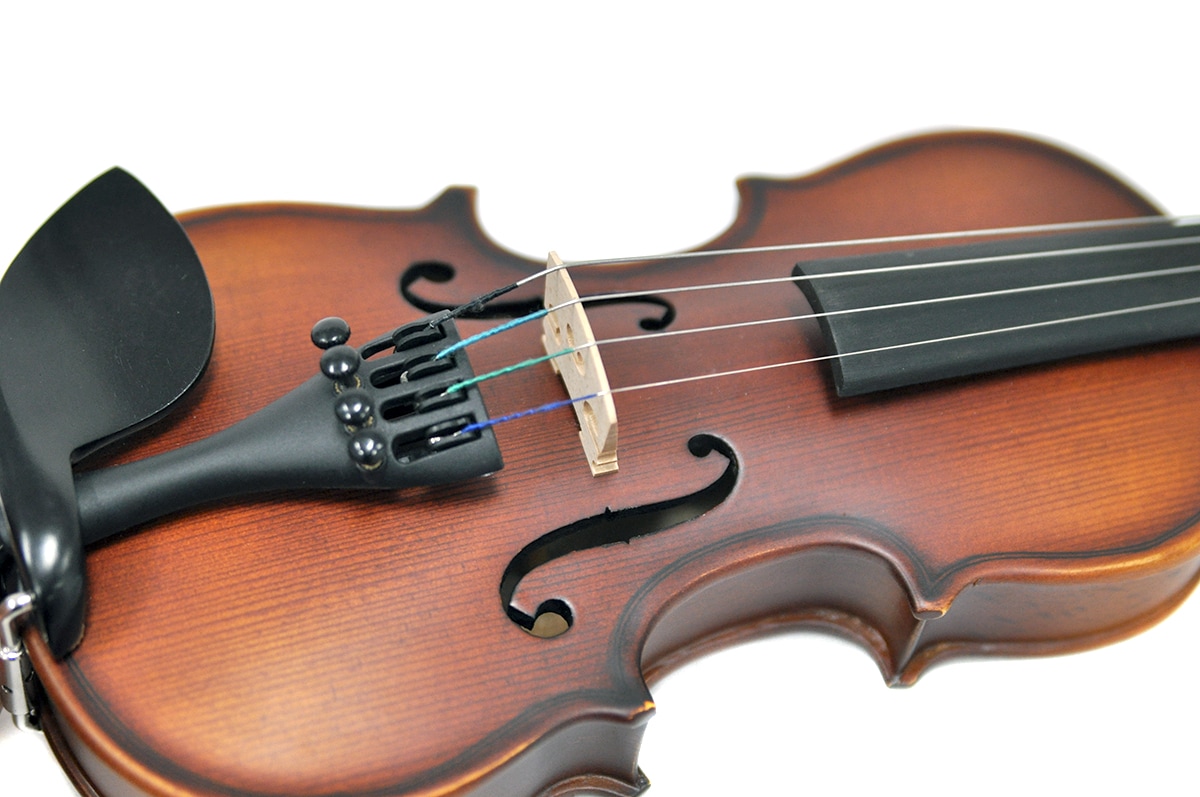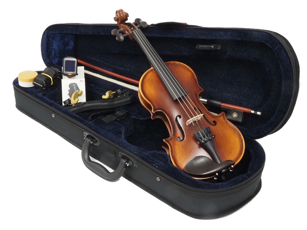 初心者にも嬉しいアイテムが付属。弓・松脂・ケース・チューナー・肩当がついてきます。