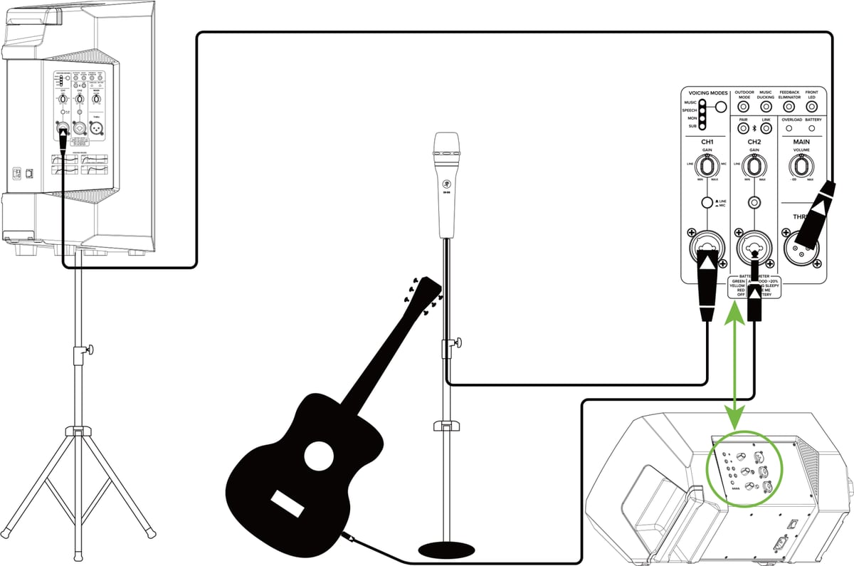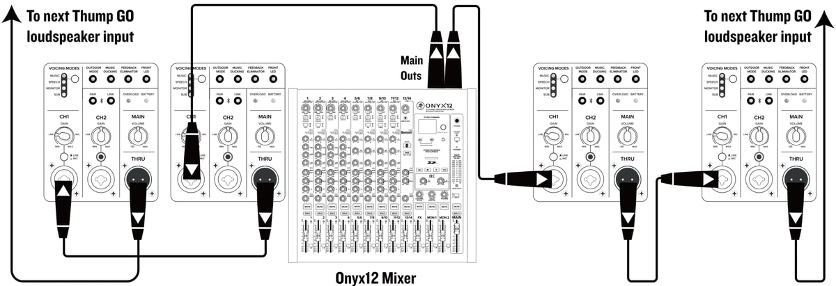 ギター、マイク、キーボード、DJミキサーなど、あらゆる音源を自由にミックス。Thump GO には、XLR/TRSコンボ入力を2系統搭載。さらにチャンネル2には3.5mm AUX入力もあり、スマートフォンやラップトップなどの再生機器とも簡単に接続できます。