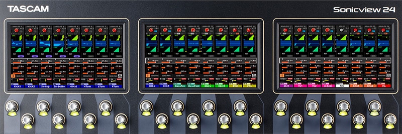 TASCAM SonicviewはチャンネルごとにチャンネルネームLCDを装備。ロータリー・エンコーダは、押し込むことでパラメーターの値を大きく動かすことができ、微調整から範囲の広いパラメーターまで容易に操作が可能です。