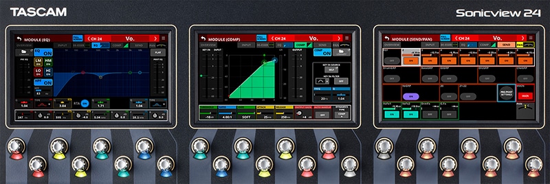 『VIEWインターフェース (Visual Interactive Ergonomic Workflow) 』をコンセプトとしたTASCAM Sonicview 16は2画面、TASCAM Sonicview 24には3画面、それぞれ8つのエンコーダーを備えた7インチ・タッチ・スクリーンを搭載。複数のパラメータや設定を表示可能なタッチパネルはストレスフリーで素早く直観的な操作性を実現、音創りに集中できる優れたコントロールサーフェイスとなっています。