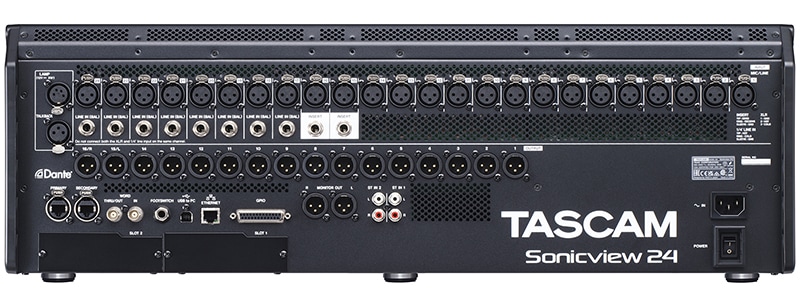 アナログ入力はTASCAM Sonicview 24が24チャンネル、TASCAM Sonicview 16は16チャンネルのXLRバランス入力を、出力は16系統のXLRバランス出力端子を装備しており、本体アナログ入出力のみでも小中規模のシステムに十分対応可能です。